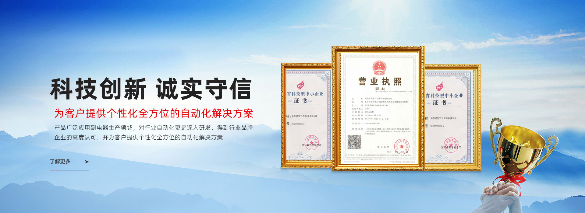 樂(lè)清市伊宏自動(dòng)化設(shè)備有限公司創(chuàng)立于2013年,與中國(guó)電器之都樂(lè)清市柳市鎮(zhèn)相鄰,公司擁有現(xiàn)代化廠房,是一家專(zhuān)業(yè)研發(fā)低壓電器自動(dòng)化生產(chǎn)的科技型企業(yè),擁有多項(xiàng)電器自動(dòng)化生產(chǎn)設(shè)備專(zhuān)利,公司生產(chǎn)銷(xiāo)售的設(shè)備有各種微型斷路器裝配生產(chǎn)線,各種斷路器滅弧室自動(dòng)化生產(chǎn)設(shè)備,各種斷路器磁芯自動(dòng)化生產(chǎn)設(shè)備,各種斷路器磁組件及機(jī)械聯(lián)動(dòng)機(jī)構(gòu)組件自動(dòng)化生產(chǎn)設(shè)備,各種斷路器組件焊接設(shè)備,以及機(jī)器人協(xié)同自動(dòng)化配套設(shè)備定制。